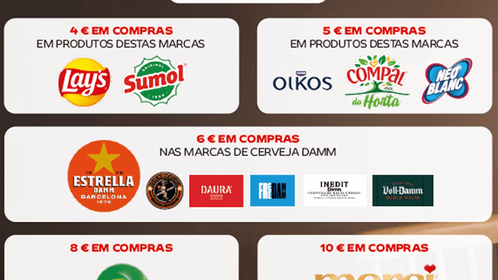 - por cada 6€ (seis euros) em compras associadas ao Cartão Continente, efetivamente pagas, em artigos das marcas de cerveja “Damm”, (incluindo “Estrella”, “Daura”, “Voll”, “Inedit”, “Bock” e “Free”);